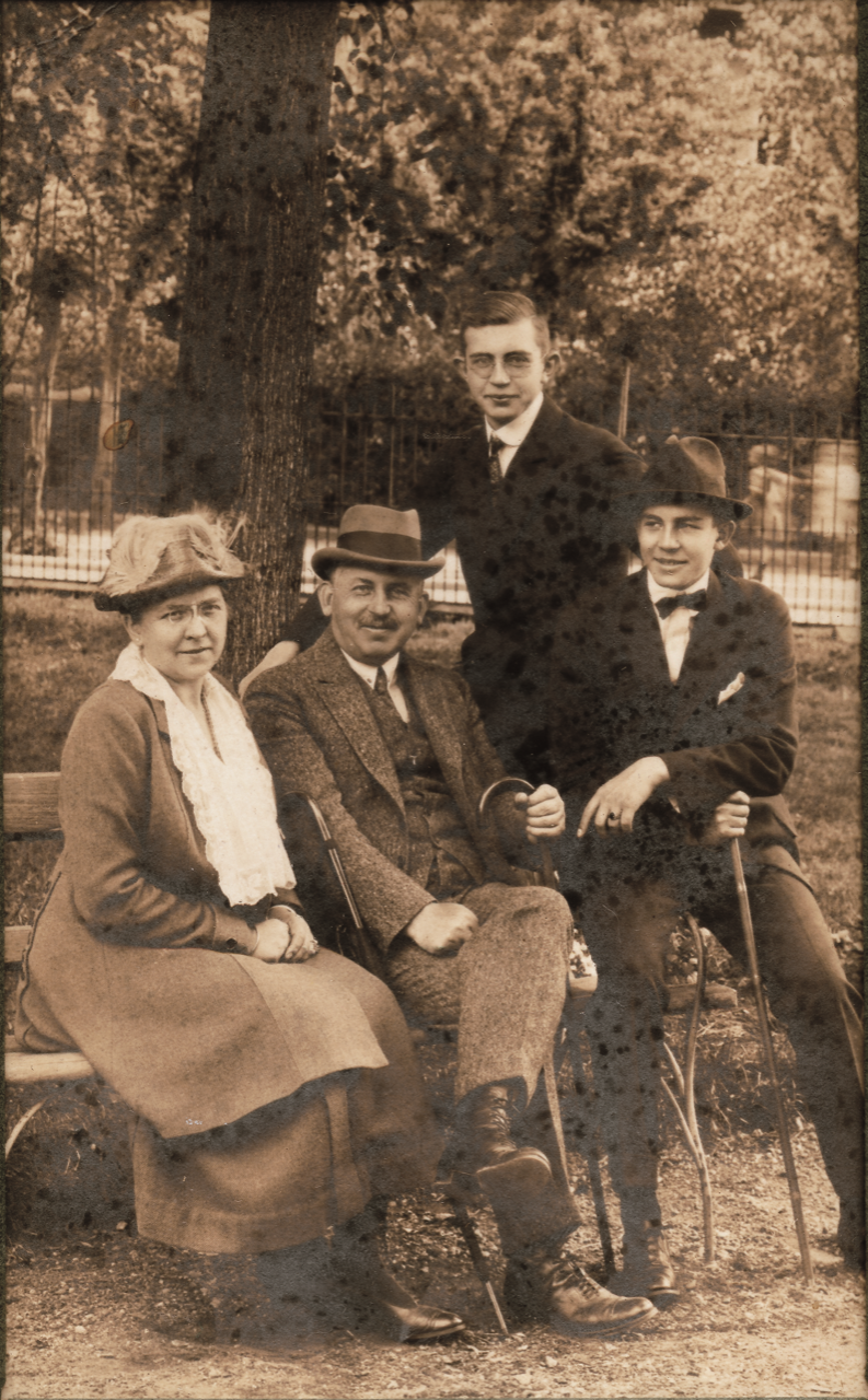 Ein letztes Foto vor der Katastrophe. Gustav Krolzig mit seiner Ehefrau Meta geb. Schöndau. Zusammen mit ihren Söhnen Günter und Werner. Reinhard, der Dritte fehlt. Zufall? Er sollte eigentlich ein Mädchen werden. In den ersten Lebensjahren wurde er versteckt und mußte Röcke tragen. Ein früher, unfreiwilliger Trans-Mensch.