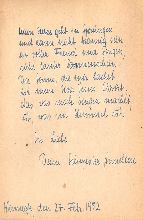 Wie ein Puzzel passt am Ende alles zusammen. Zufällig fand ich Ende Juni 2023 mein altes Poesiealbum. Darin der unten stehende Eintrag aus dem Jahr unserer Harzreise 1952. Von Anneliese stammt übrigens der einzige wirkliche Poesie-Eintrag in dem Bändchen. Es ist die letzte Strophe aus Paul Gerhardts “Ist Gott für mich so trete gleich alls hinter mich”.