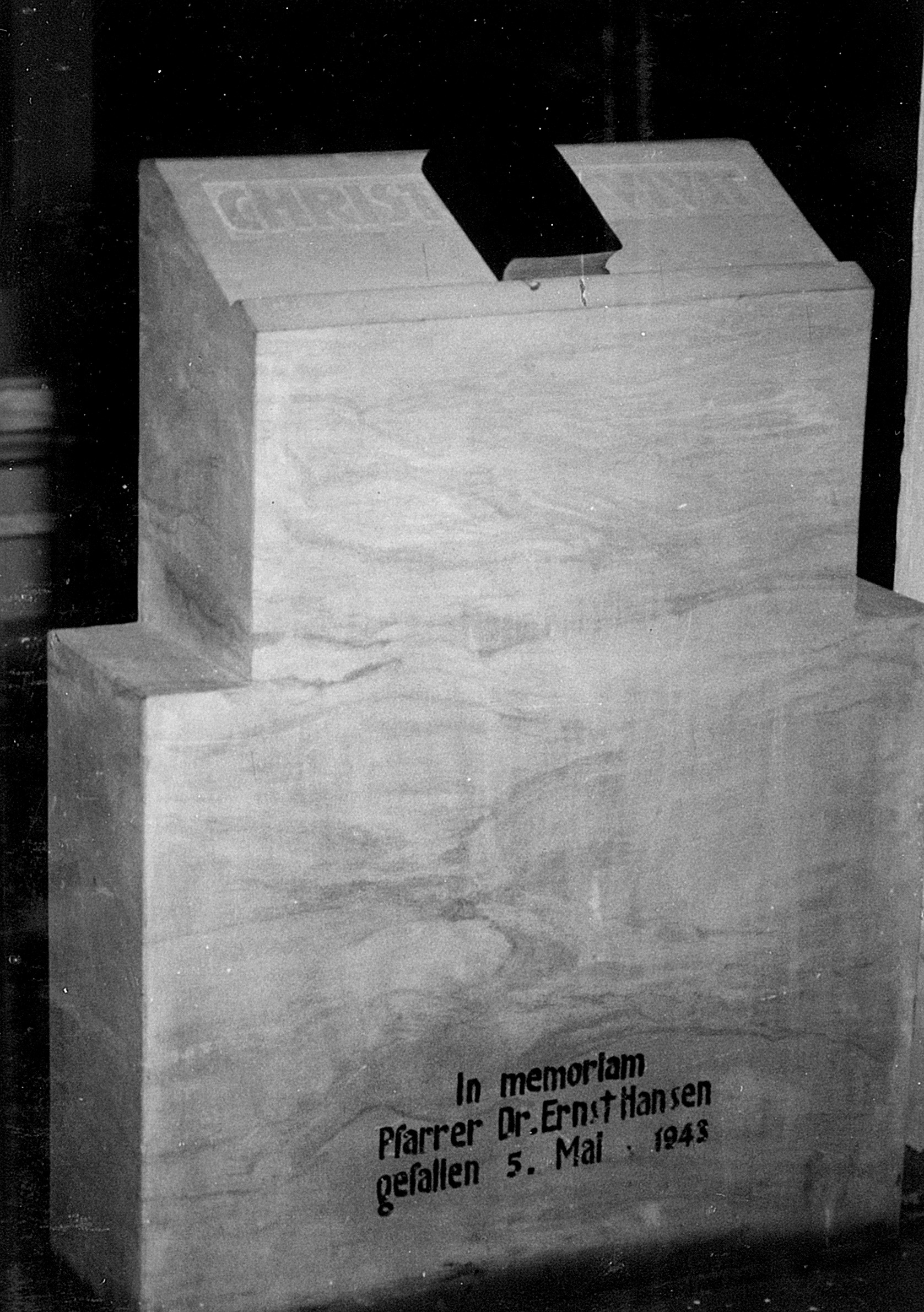 Zweimal findet sich sein Name in Stein gemeißelt in der Kirche, zweimal wird seiner in St. Johannis zu Niemegk für alle Zeiten gedacht: Dr. Ernst Hansen. Einmal unübersehbar unter „Unseren Opfern“ bei den Gefallenen des Jahres 1943, dann eher unauffällig auf der unteren Rückseite des steinernen Lesepultes. Da liest der Besucher: „In memoriam Pfarrer Dr. Ernst Hansen gefallen 5. Mai 1943“. Sein Nachfolger im Niemegker Pfarramt, also mein Vater, sorgte Anfang der Fünfziger Jahre für die Zeile.