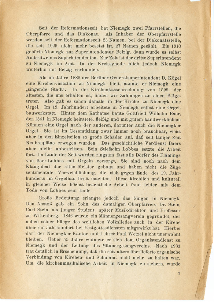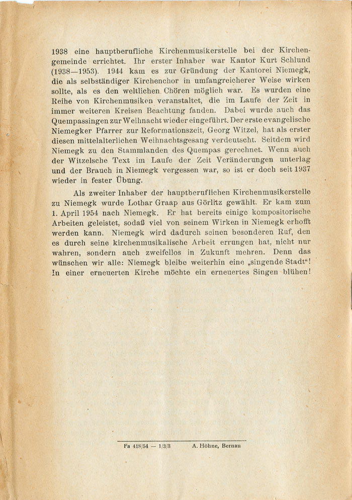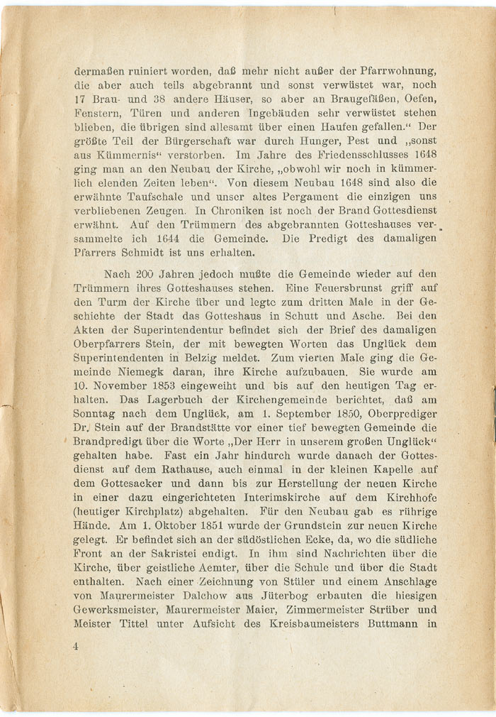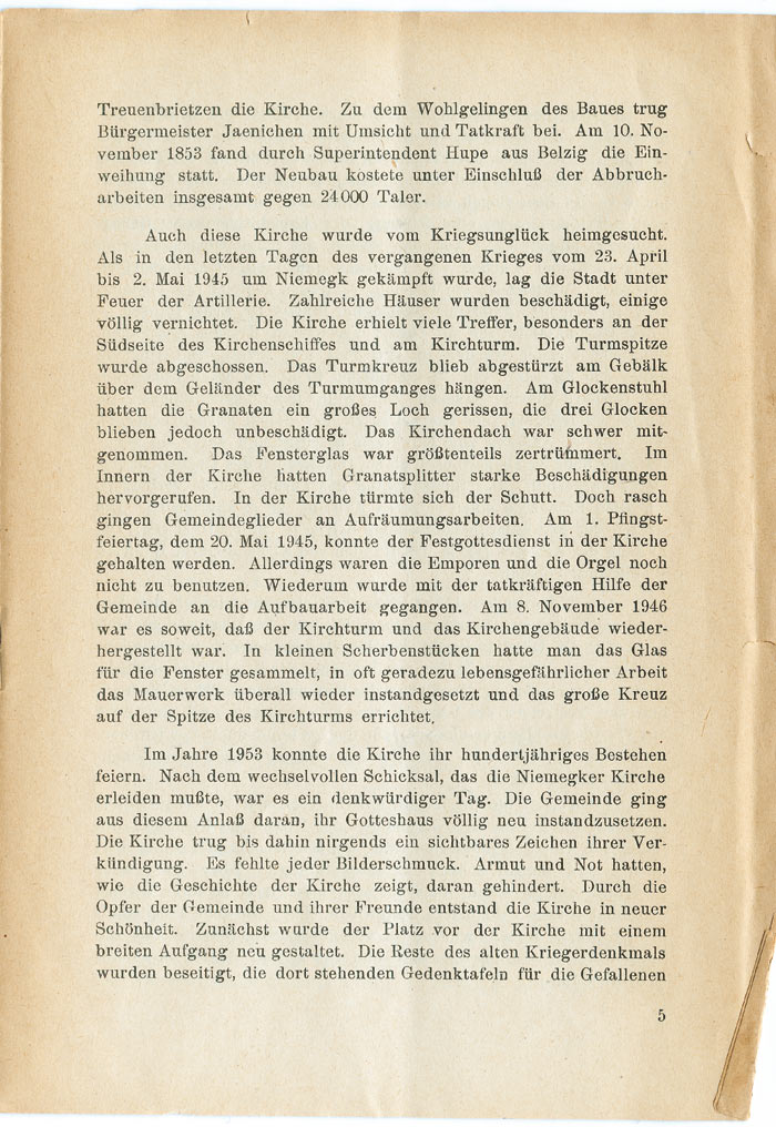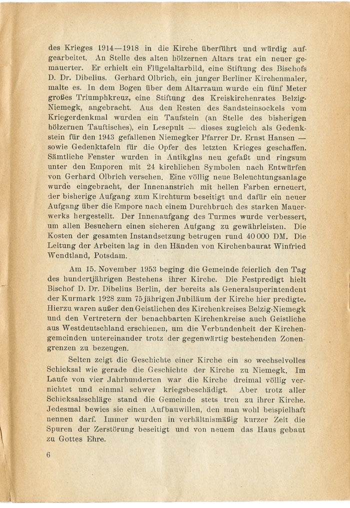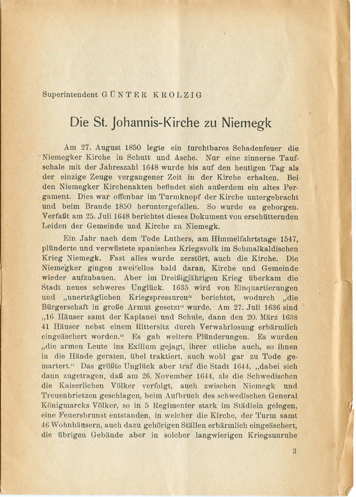 Die Geschichte der Johanniskirche von Günter Krolzig ist ein Sonderdruck aus der Festschrift zum 800. Jubiläum von Niemegk. Die Stadt präsentiert sich hier im Stolz auf ihre Geschichte. Immerhin lag da das Ende des 2. Weltkrieges erst ein paar Jahre zurück. Die waren 1954 auch in Niemegk noch deutlich zu sehen.
