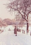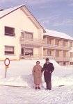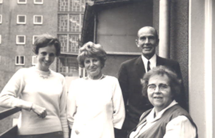 Bei Ankunft der neuen Bundesbürger stand von dem Haus in Bierenbachtal erst der Rohbau. Also mußte eine Zwischenlösung her; die tat sich in Düsseldorf in einem Haus des Gesamtverbandes (Hintergrund) auf. Bald konnte der Vater dort ersten Besuch fotographieren: Links Deta Schlund, geschiedene Ehefrau des ehemaligen Kantors in Niemegk, rechts Bruder Werner mit Tante Lotti.
