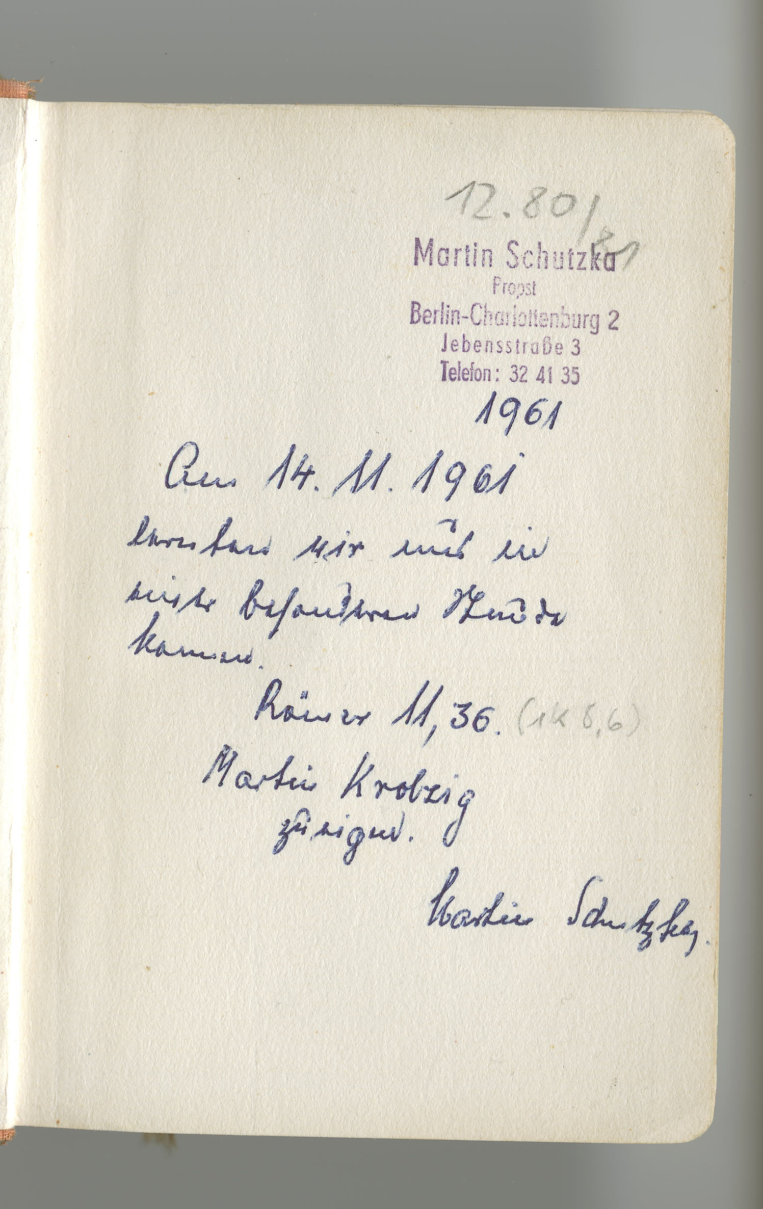 An seinem Schreibtisch saß Propst Martin Schutzka. Er hörte sich meine Geschichte an und überlegte mit mir, wie er mich unterstützen könne. Zu Abschluß schenkte er dem jungen Theologiestudenten das Neue Testament. Das hatte er wohl gerade für sich selbst gekauft.
