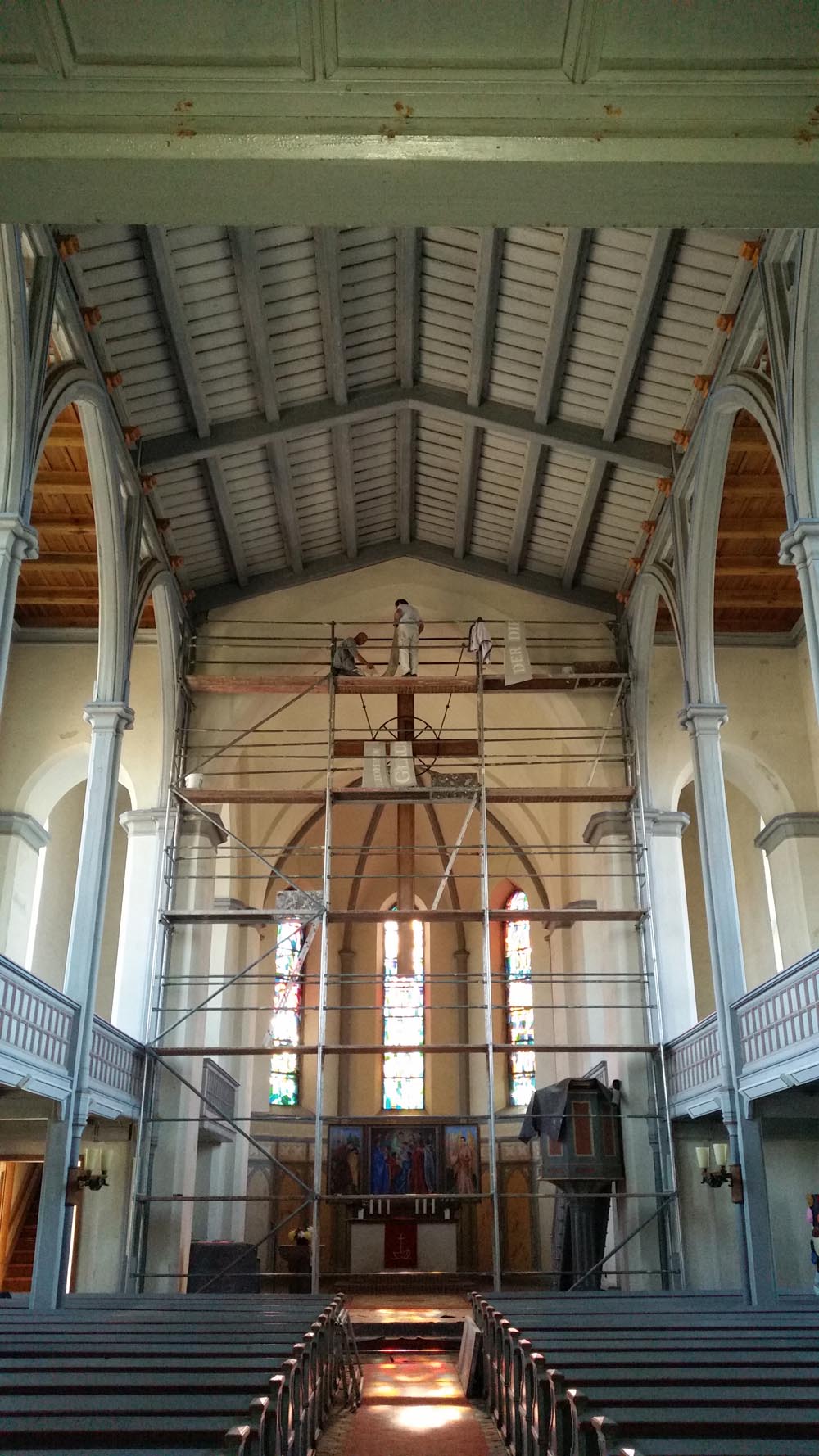 In dem Jahr hing das Triumphkreuz bereits. Etwa um die gleiche Zeit wurde darüber der Spruch aus dem 1. Jonannisbrief gemalt. Die Kirche war in einem Kraftakt der Gemeinde nach den letzten Kämpfen um Berlin vom Frühjahr 1945 gerade wieder benutzbar geworden. Ja, durchaus schöner und gottgefälliger als vor dem Weltkrieg.