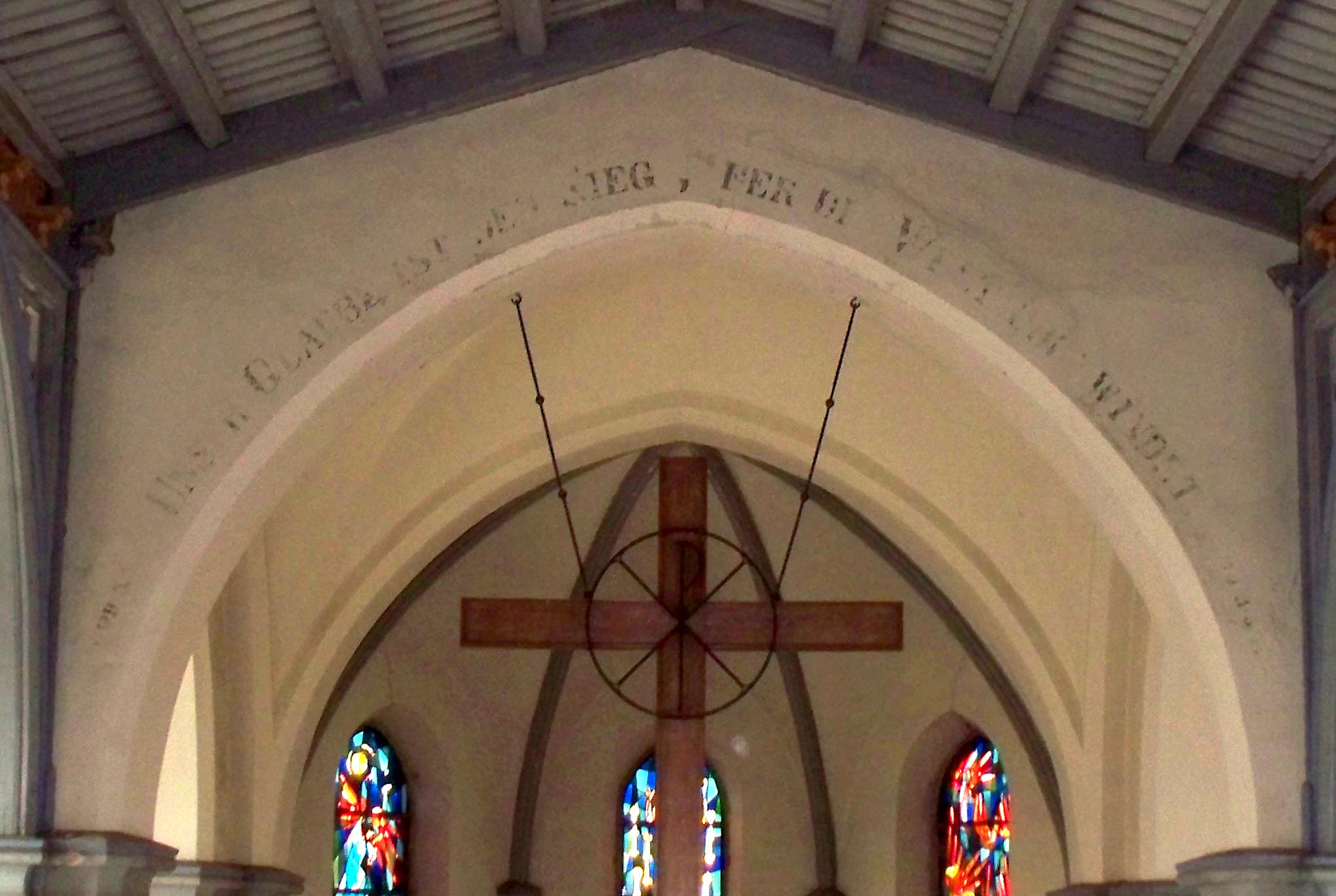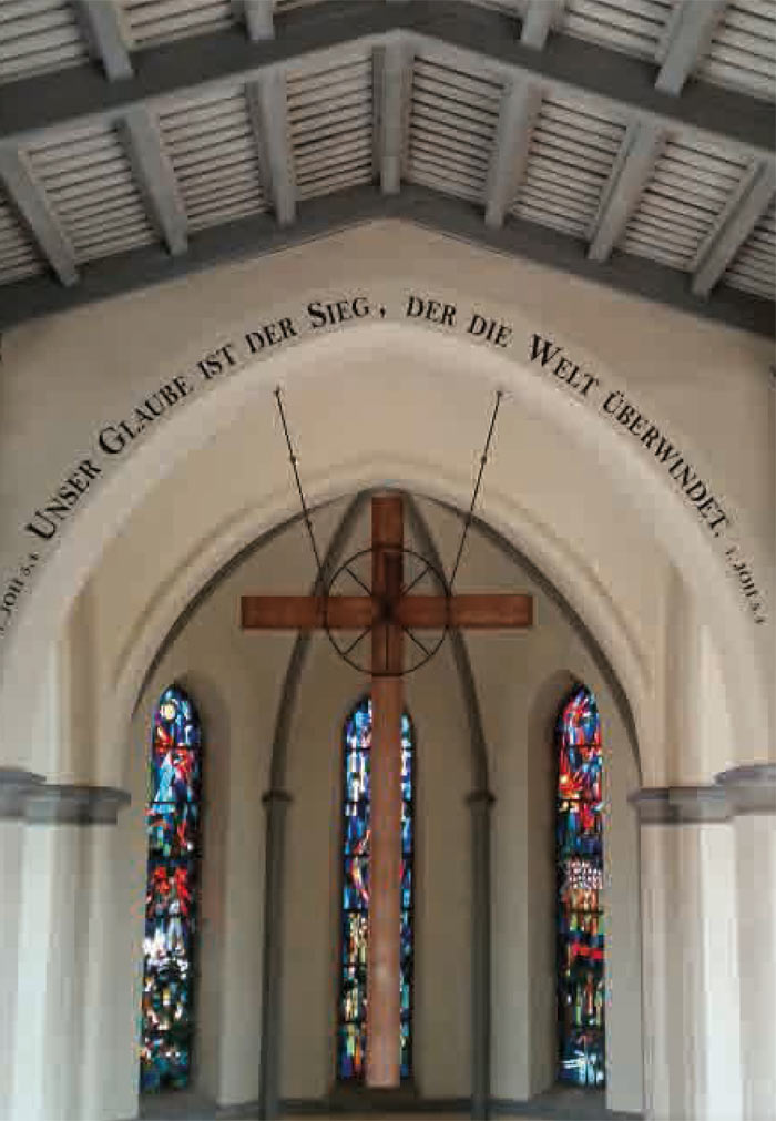 Als Krönung über allem das Triumphkreuz mit der Siegesbotschaft. Die ist genauso unübersehbar wie eindeutig. Um kein Mißverständnis aufkommen zu lassen: Verkündet wird der Triumph des ans Kreuz genagelten, gefolterten und getöteten Jesus Christus. Wer ihm auf seiner Lebens-Map nachfolgt befindet sich auf der Siegesstraße. Das heißt glauben.