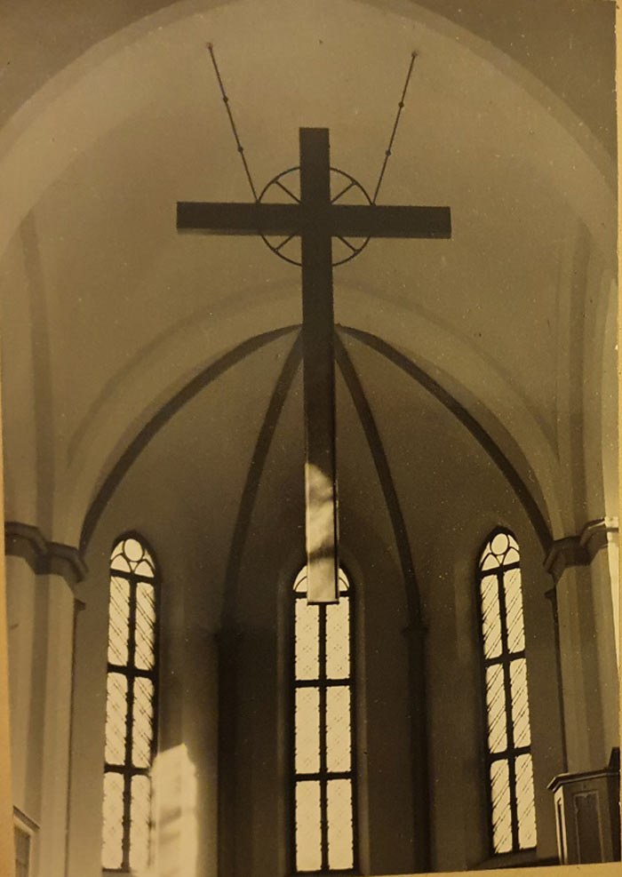 Das ist das erste mir bekannte Foto des Triumphkreuzes. Es erstrahlt gewissermaßen nackt in der Mitte der Kirche. An bunte Glasfenster wird damals bestimmt noch niemand gedacht haben. Aus Familienberichten weiß ich, dass die ganz normale Verglasung der hohen Fenster allein einen Kraftakt bedeutete.
