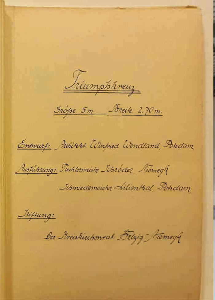 Die Seite 4 der Klappkarte hält fest, wer das Triumphkreuz entworfen und wer ist ausgeführt hat (die Seite 3 der Karte ist freigehalten). Das Blatt entstammt dem »Goldenen Buch der St. Johanniskirche«; das bemerkenswertes Dokument kann hoffentlich auch bald ediert werden. Darin wird für alle Zeiten festgehalten, wer etwas zum Neuaufbau des Gotteshauses beigetragen hat.