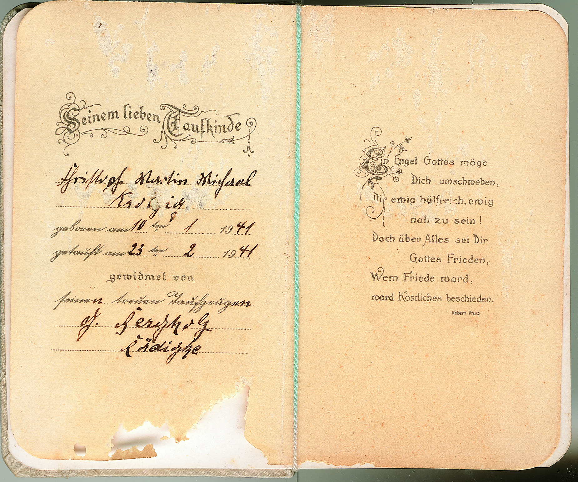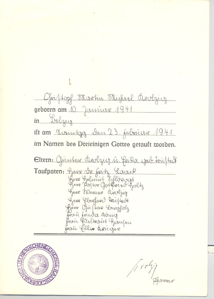 Blog 15.8.23 Taufbüchlein Getauft wurde Christoph, Martin, Michael Krolzig am 23. Februar 1941 in der eiskalten Rädigker Kirche. © Martin Krolzig