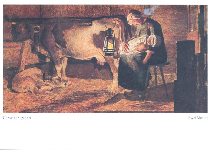 Darunter rechts der Titel, links der Name des Malers und Komponist des Gemäldes Giovanni Segantini. Doch Sie sehen mit Ihrem inneren Auge das Christkind in Windeln gewickelt, den Stall von Bethlehem, Maria mit dem Jesuskind. Und im m Zentrum das himmlische Licht.